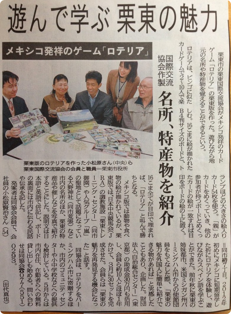 栗東ロテリアの紹介が新聞に掲載されました! 2014 4/11 最近の活動の様子 2014年4月11日 URLをコピーする URLをコピーしました! 4/11(金)の京都新聞に、平成25年度一年間かけて製作してきた”栗東ロテリア”の紹介を取り上げていただきました。 楽しく栗東の名所等を学べるツールとして、たくさんの方に知っていただければ嬉しく思います。 5月からは貸出しを考えていますので、ご興味ある方はぜひお問い合わせください。 最近の活動の様子 この記事が気に入ったら いいねしてね! よかったらシェアしてね! URLをコピーする URLをコピーしました! 栗東ロテリアが完成しました! 呈茶(Tea ceremony)& Let's栗東ロテリア