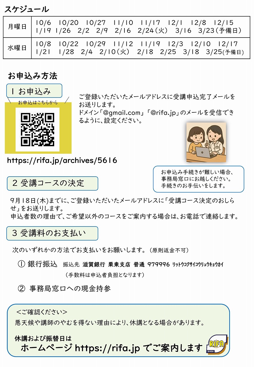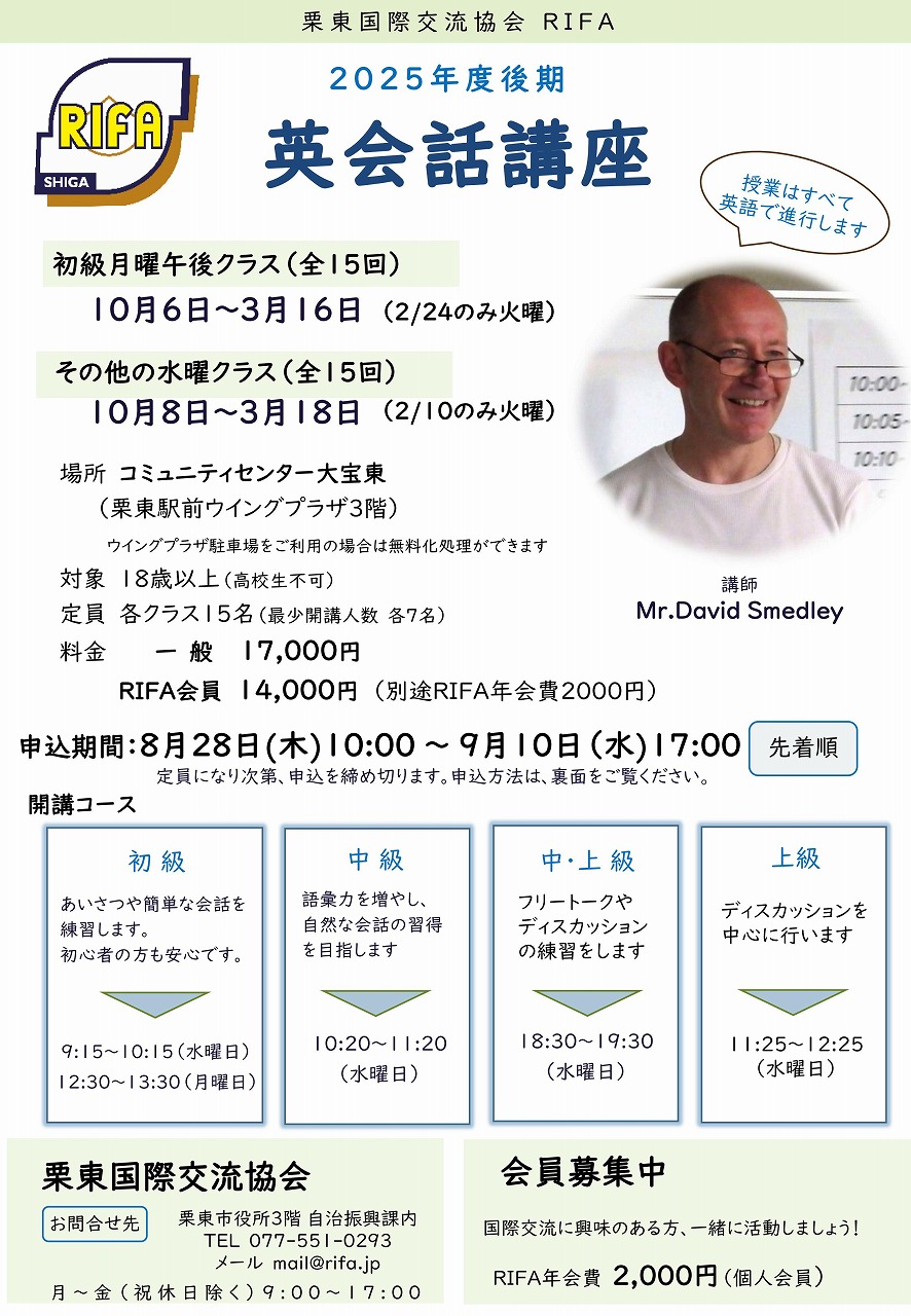 RIFA英会話講座2025年後期 申込フォーム 2025 8/27 未分類 2025年8月27日 URLをコピーする URLをコピーしました! 申込期間: 8月28日(木)10:00 ~ 9月10日(水)17:00 月曜クラス 10/6~3/16(2/24のみ火曜) 水曜クラス 10/8~3/18(2/10のみ火曜) (全15回) イギリス出身のDavid Smedley 講師の英会話講座です。 あなたも楽しく英語力をレベルアップしてみませんか? 申込フォームはこちら↓ チラシのダウンロード(PDF) 未分類 この記事が気に入ったら いいねしてね! よかったらシェアしてね! URLをコピーする URLをコピーしました! 8/26 大阪万博日帰り旅行 参加者募集! 第50回異文化交流サロン