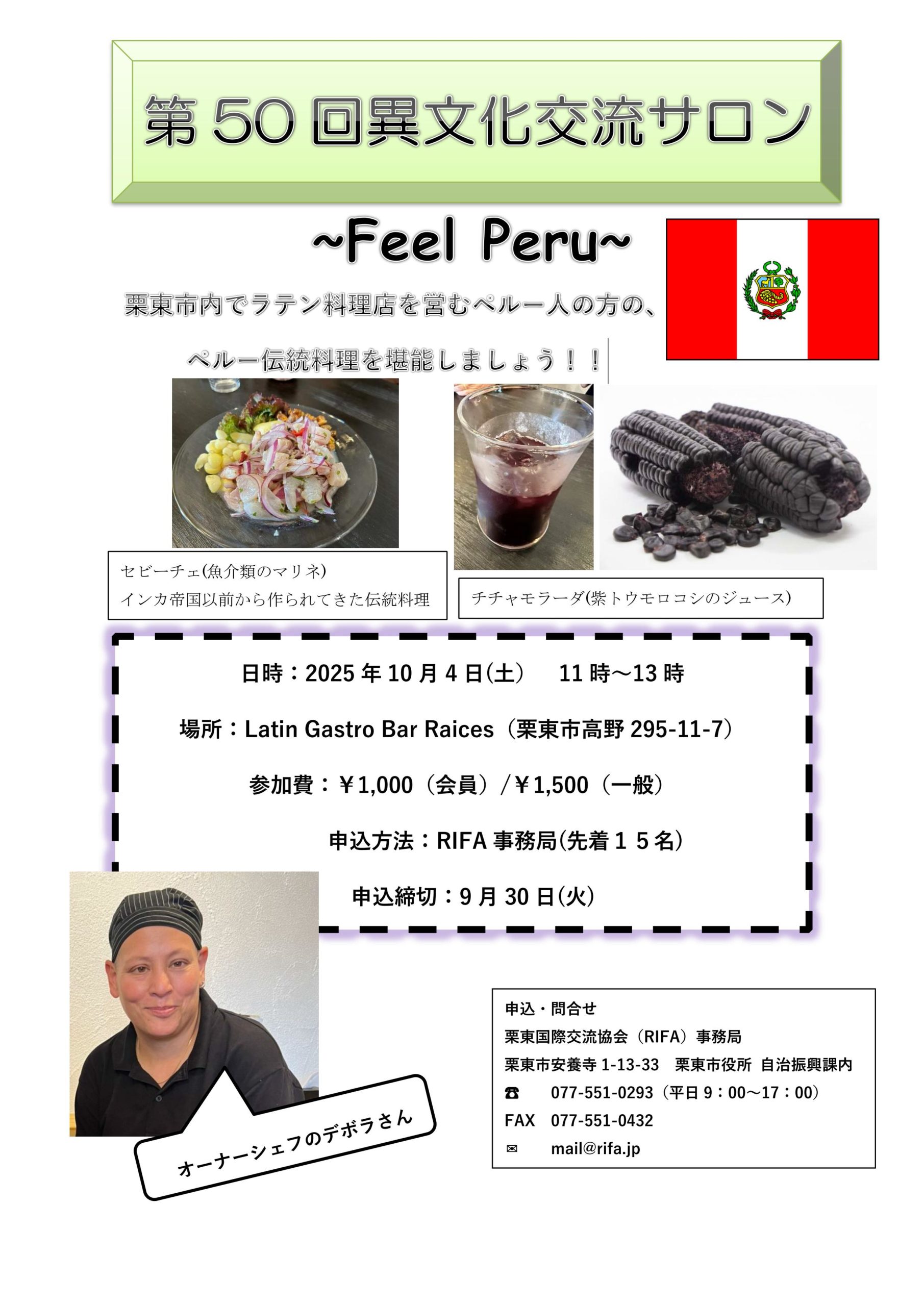 第50回異文化交流サロン 2025 9/03 未分類 2025年9月3日 URLをコピーする URLをコピーしました! 10/4(土)11:00~13:00 ペルー料理を味わい、ペルーについてのお話しを聞いてみませんか? 先着15名までなので、お早めに申し込んでください。 第50回異文化交流サロンのチラシ(ダウンロード:PDF) 未分類 この記事が気に入ったら いいねしてね! よかったらシェアしてね! URLをコピーする URLをコピーしました! RIFA英会話講座2025年後期 申込フォーム 第50回異文化交流サロン 定員に達しました !