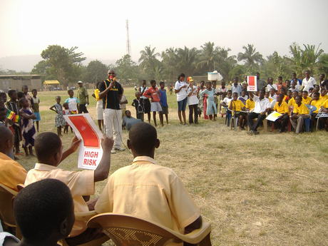 ![]() ガーナでのボランティア活動はエイズ予防とエイズの正しい知識の普及です。 クイズをして、 コレはダメ!という答えにははレッドカードを出します。 そう!ガーナの人々はサッカーが大好きなのです。 |