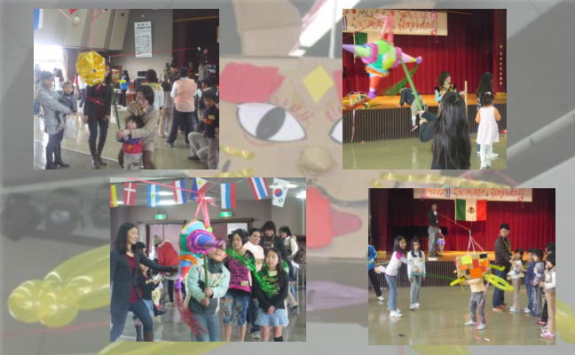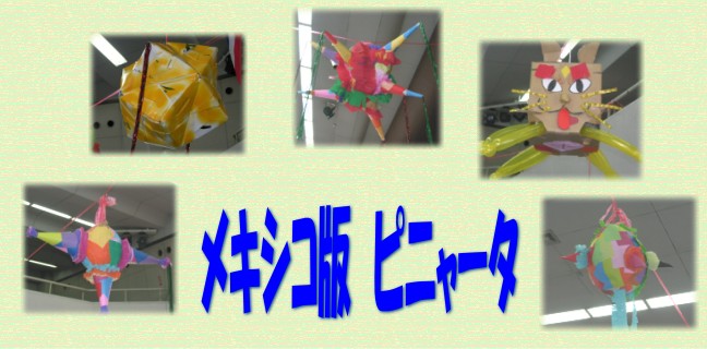 ![]() クリスマスパーティーや誕生パーティーなどのイベントには欠かせない 「ピニャータ」! メキシコではクリスマスが近づくと市場や街中にピニャータが たくさんぶら下げられるそうです。 ![]() ![]() (↑クリックで音楽が再生されます) 音楽に合わせて棒でピニャータをたたくと・・・ ピニャータの中からお菓子が落ちます! お菓子を拾って、子供も大人も大喜び! 一番お菓子を産み落とした?のは「ネコのニャータ」でしたニャ〜! おわりに「世界と出会う玉手箱」シリーズ、今回のメキシコ・クリスマスパーティー たくさんのご参加ありがとうございました。 (楽しんでいただけたでしょうか?) 前準備から当日のお手伝い、出演をお願いした皆様、ご協力ありがとうございました。 〜またお会いしましょう〜 |