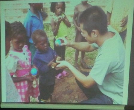 | モザンビークでは、 理数科教師として活動する一方、 けん玉大会も実施。 体調を崩して、一時帰国をしたり・・・ 苦しいこともあったり・・・・ でも、モザンビークの人々の笑顔に出会えた幸せ。 窪田さんの話に、みんな引き込まれていきます。 |